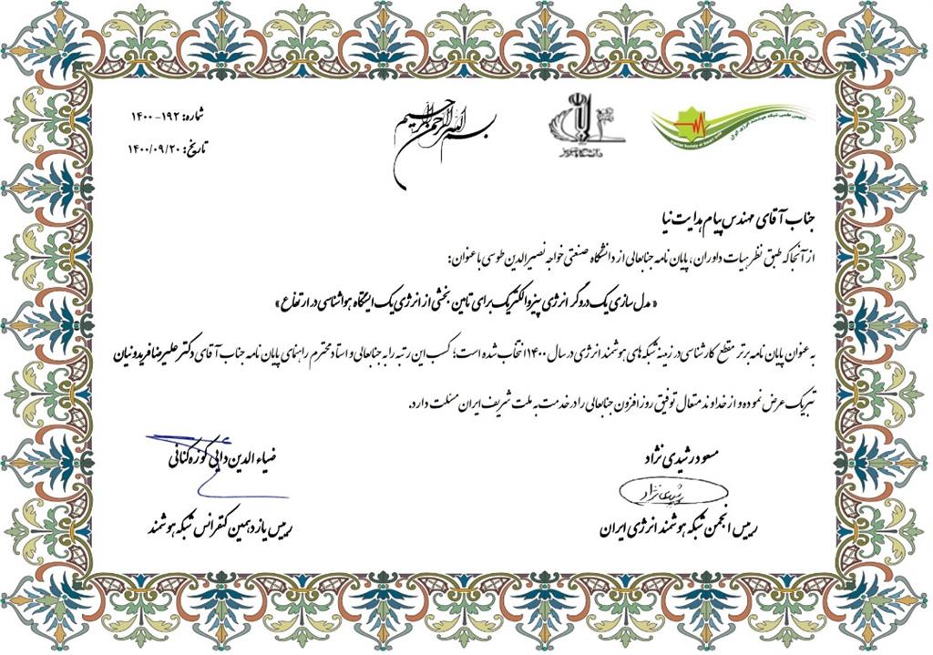 پروژه کارشناسی پیام هدایت نیا به عنوان پایان نامه برتر مقطع کارشناسی توسط انجمن علمی شبکه هوشمند انرژی انتخاب شد