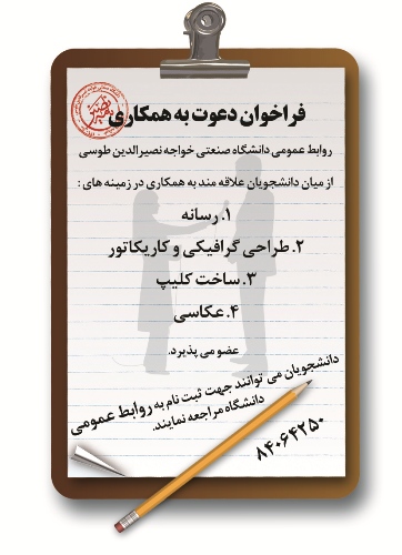 به گزارش رعد: روابط عمومي دانشگاه صنعتي خواجه نصير الدين طوسي در نظر دارد جهت تكميل كادر دانشجويي خود از دانشجويان فعال در زمينه هاي خبري گرافيك، ساخت كليپ و عكاسي دعوت به همكاري نمايد .