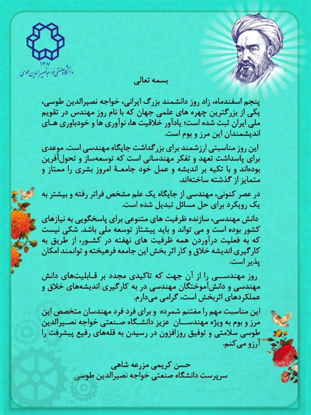 به گزارش روابط عمومی؛ دکتر حسن کریمی مزرعه شاهی، رئیس دانشگاه با صدور پیامی مقام اندیشمند فرزانه، خواجه نصیرالدین طوسی و روز مهندسی را گرامی داشت. در این پیام آمده است: