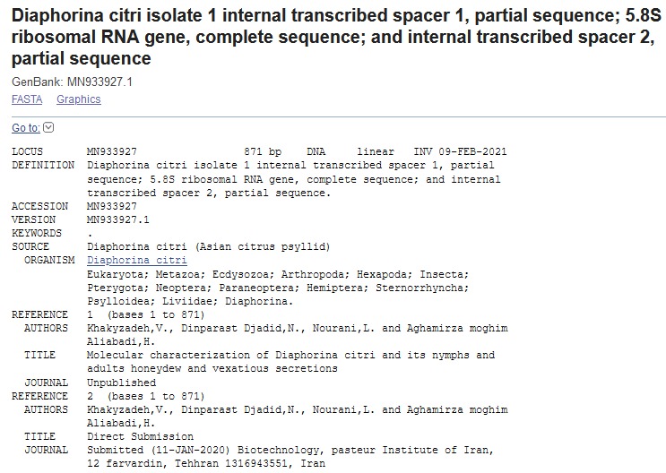 در همین راستا توالی دو نمونه جدید در ژنوم این حشره را کشف کردیم و با کدهای MN933927 و MN933928 در بانک جهانی ژن (GenBank) ثبت نمودیم. لینک دسترسی به ژن های ثبت شده به شرح زیر است: