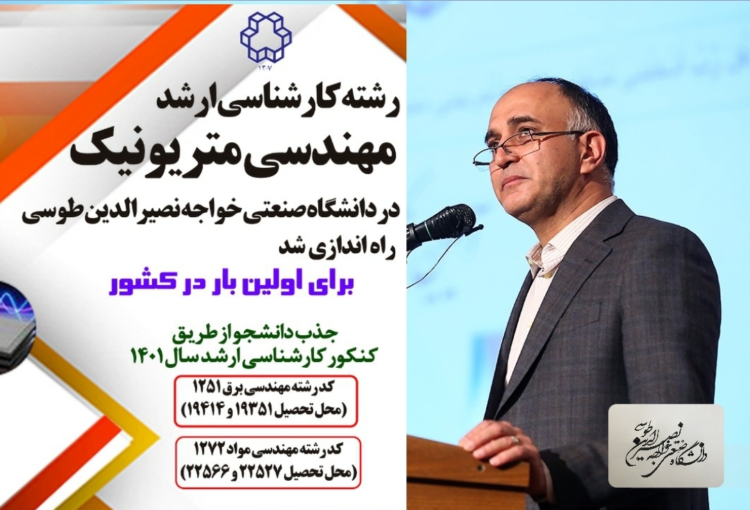 به گزارش روابط عمومی دانشگاه؛ گرایش کارشناسی ارشد مهندسی متریونیک (مواد الکترونی) برای اولین بار در کشور توسط دانشگاه صنعتی خواجه نصیر الدین طوسی ارائه شده است که دروس و پژوهش در آن به طور مشترک توسط دانشکده های مهندسی مواد و مهندسی برق ارائه خواهد شد و در کنکور کارشناسی ارشد 1401 به طور مجزا از کد رشته مهندسی مواد (1272) و کد رشته مهندسی برق (1251) دانشجو جذب خواهد نمود.
