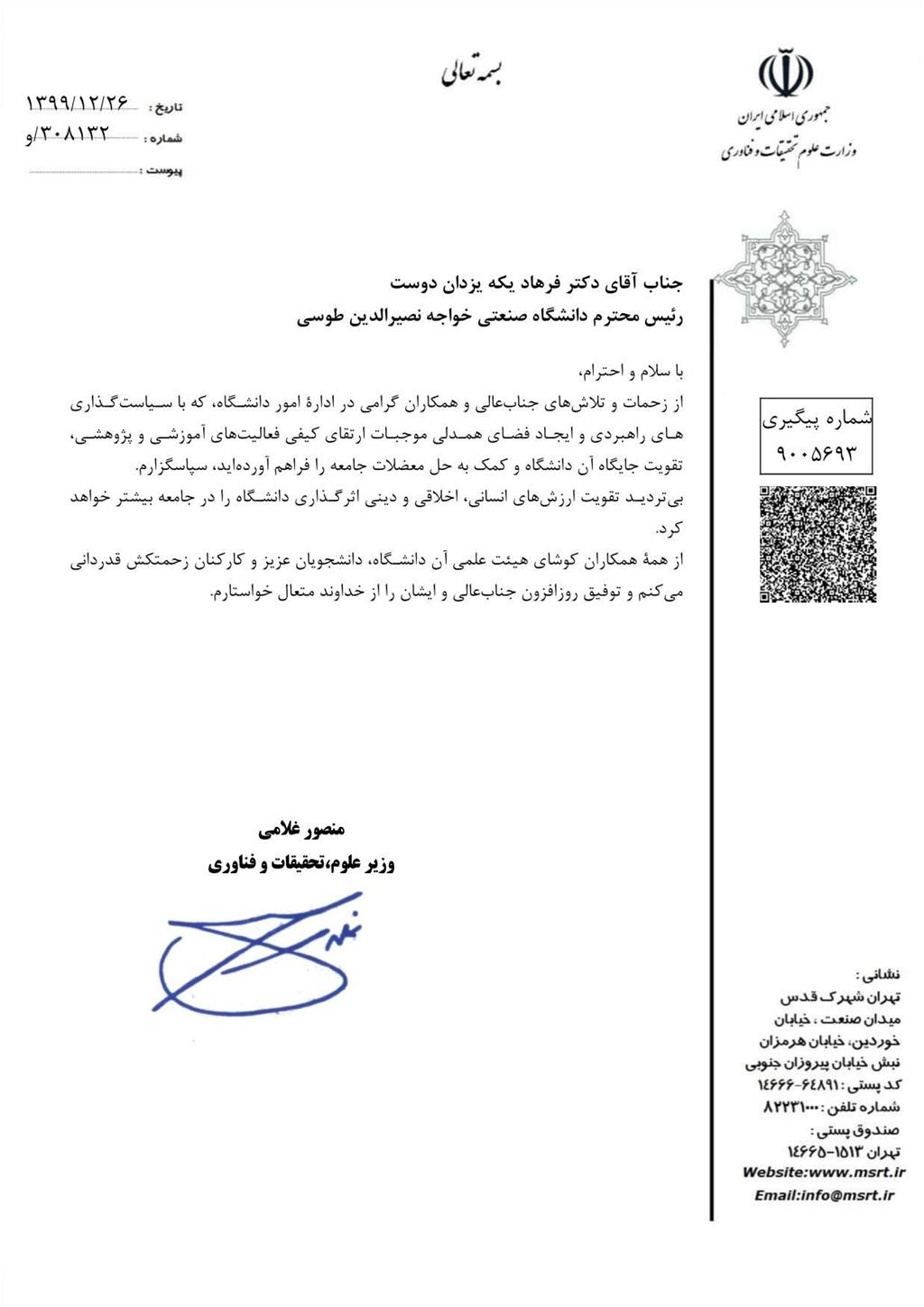 به گزارش روابط عمومی، دکتر منصور غلامی ، وزیر علوم، تحقیقات و فناوری طی نامه ای مراتب قدردانی خود را از رئیس، اعضای هیات علمی، دانشجویان و کارکنان دانشگاه صنعتی خواجه نصیر الدین طوسی اعلام داشت.