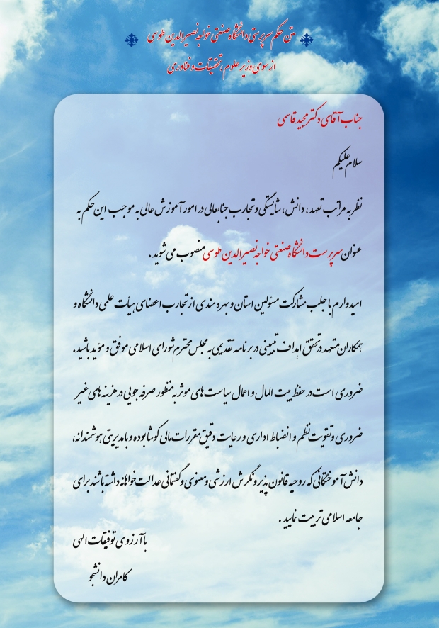 متن حكم سرپرستي دانشگاه صنعتي خواجه نصيرالدين طوسي