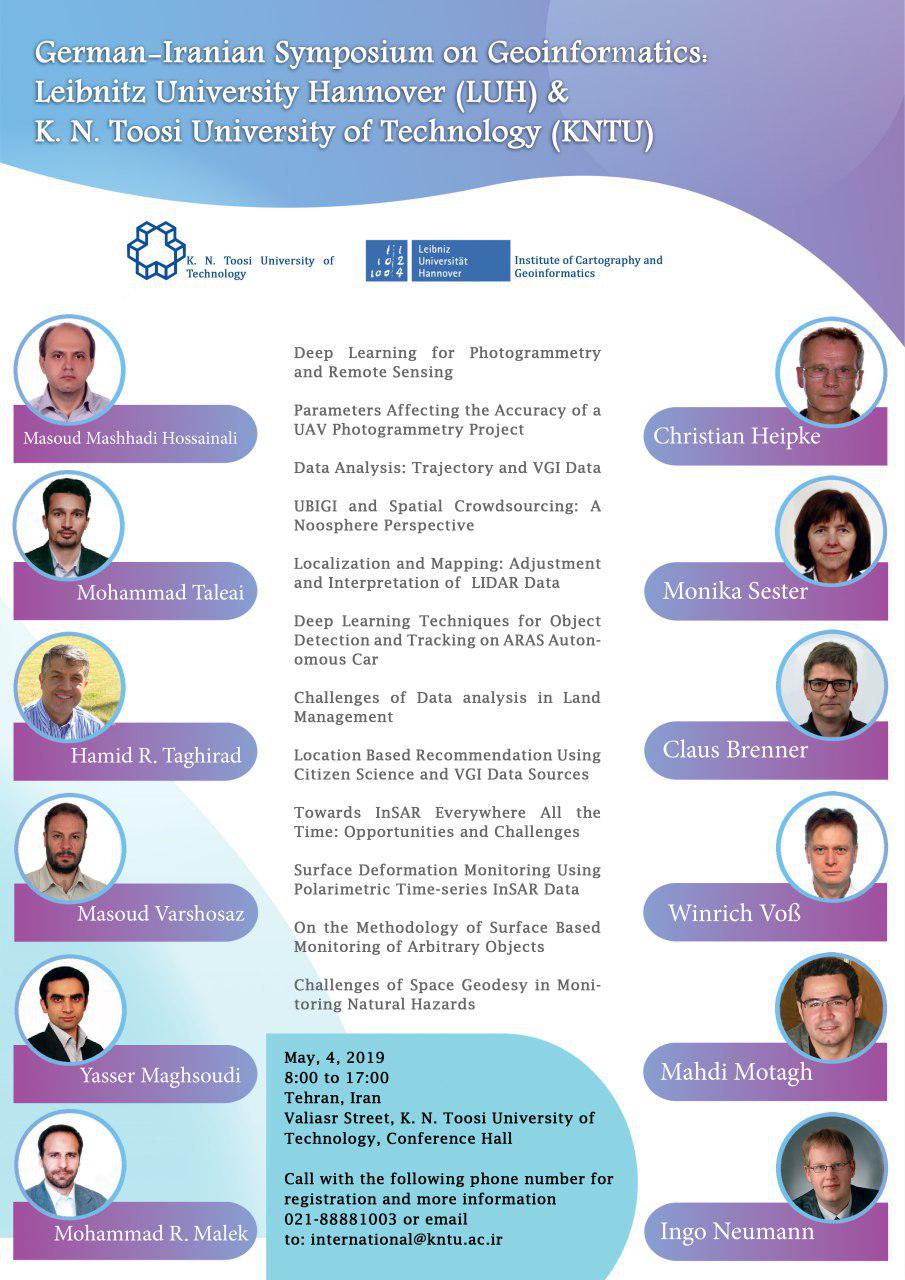با حضور تني چند از اساتيد دانشگاه هانوفر آلمان، دانشكده مهندسي نقشه برداري و دانشكده مهندسي برق دانشگاه صنعتي خواجه نصير الدين طوسي 14 ارديبهشت ماه سال جاري در محل سالن آمفي تئاتر دانشكده مهندسي عمران برگزار خواهد شد.