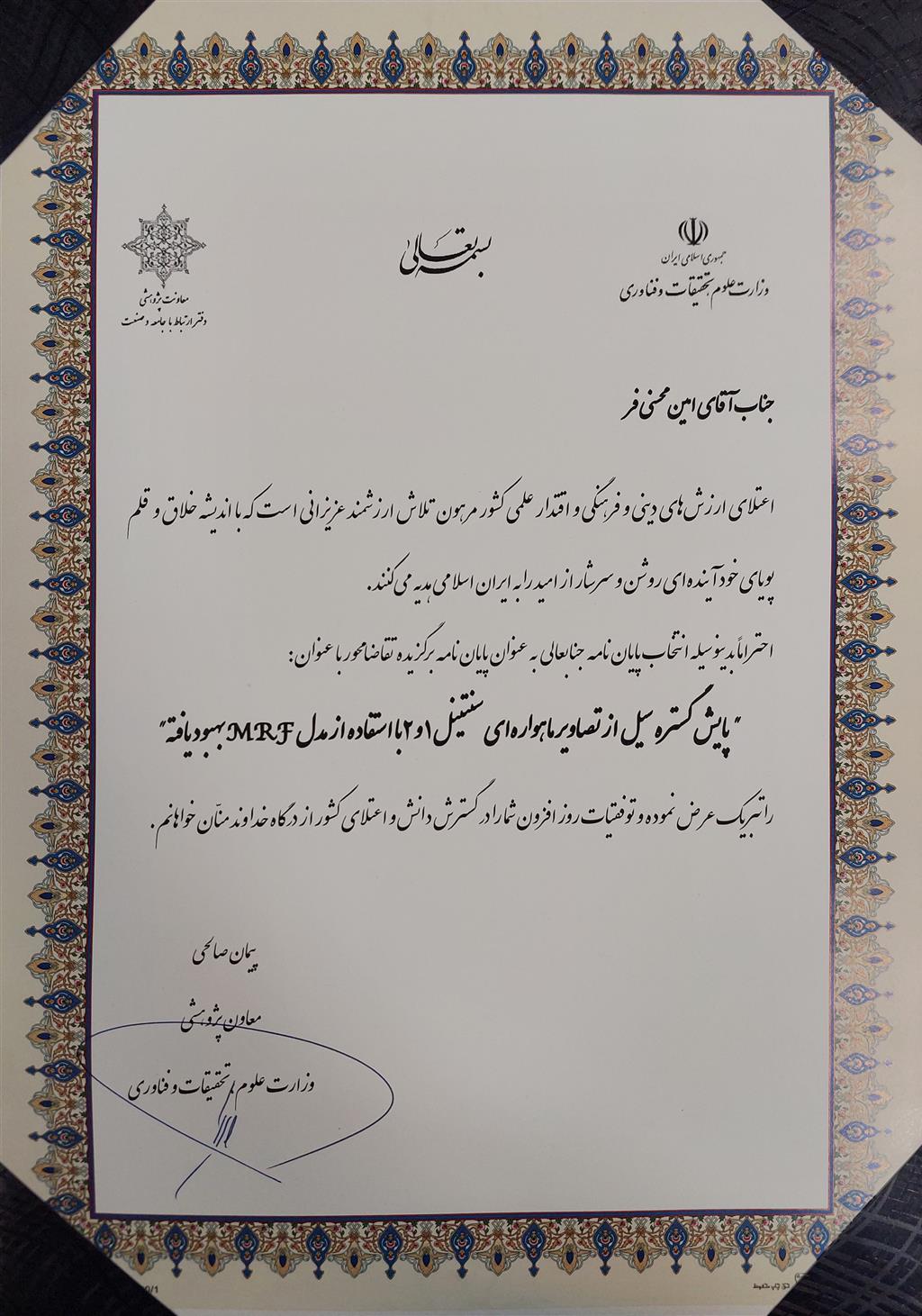 پروژه کارشناسی ارشد امین محسنی فر به عنوان پایان نامه برتر تقاضا محور ایران در حوزه ارتباط با صنعت انتخاب شد