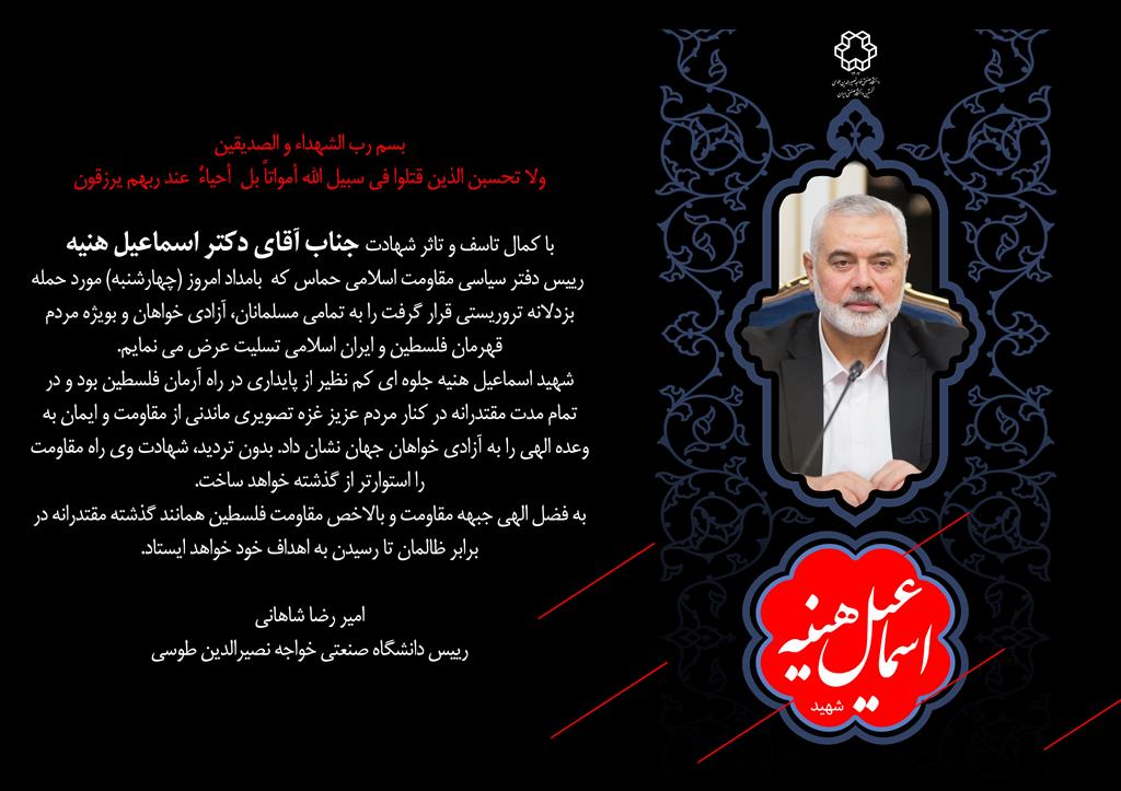 پیام تسلیت رئیس دانشگاه صنعتی خواجه نصیرالدین طوسی در پی شهادت دکتر اسماعیل هنیه، رئیس دفتر سیاسی مقاومت اسلامی حماس