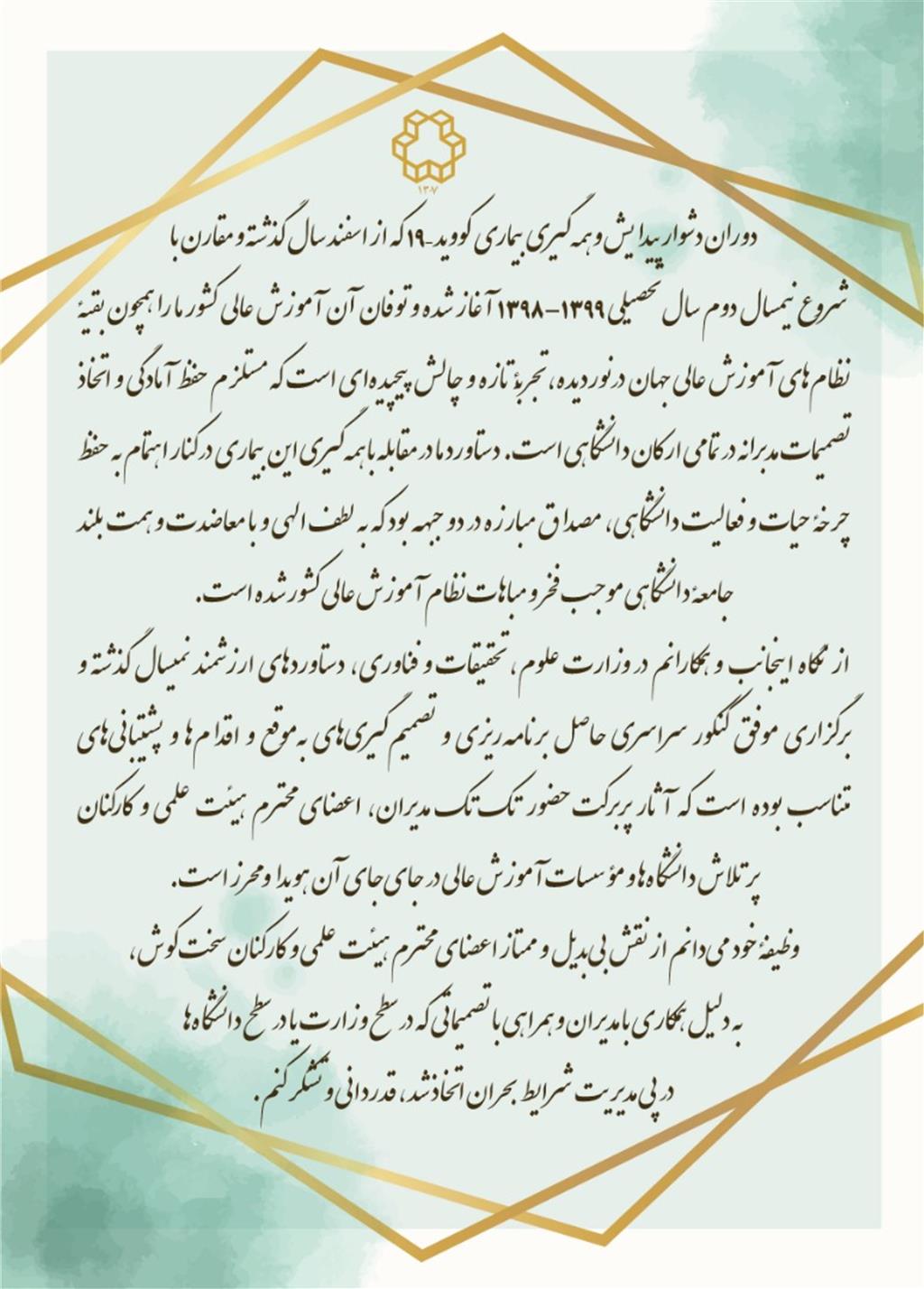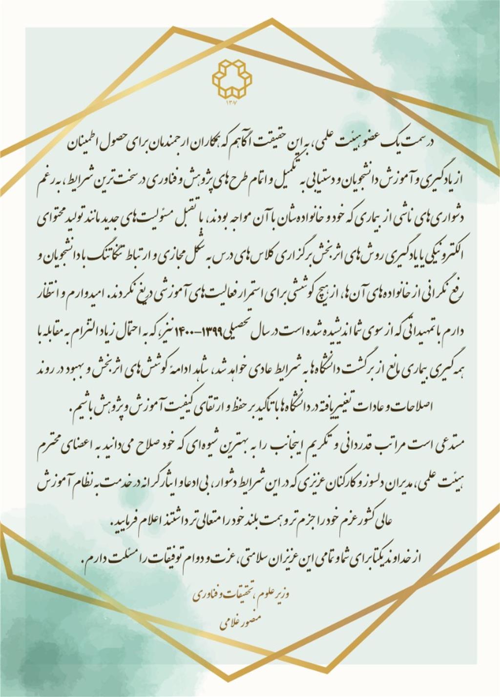 وزیرعلوم، تحقیقات و فناوری با صدور پیامی از اقدامات دانشگاهیان در ایام شیوع کرونا تقدیر و تشکر نمود در متن این پیام آمده است: