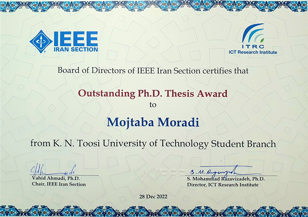 به گزارش روابط عمومی دانشگاه؛ هر ساله IEEE بخش ایران در راستای ارتقای جایگاه علمی و صنعتی رشته مهندسی برق کشور، جوایزی با عناوین مختلف جهت ارج‌ نهادن به تلاش‌های پیشکسوتان، پژوهشگران و دانشجویان اعطا می‌کند. در سیزدهمین دوره این رویداد دکتر مجتبی مرادی سپه وند فارغ‌التحصیل مقطع دکتری گروه قدرت با راهنمایی جناب دکتر امرایی موفق به کسب جایزه رساله برگزیده دکتری یا Outstanding PhD Thesis Award از طرف IEEE بخش ایران شدند.