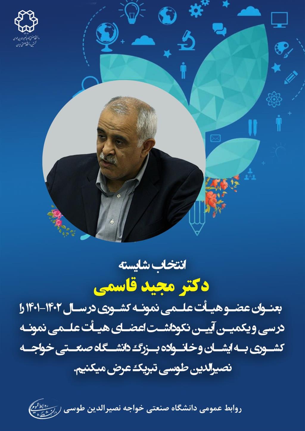 این موفقیت را به ایشان و خانواده بزرگ دانشگاه صعتی خواجه نصیرالدین طوسی تبریک عرض می کنیم.