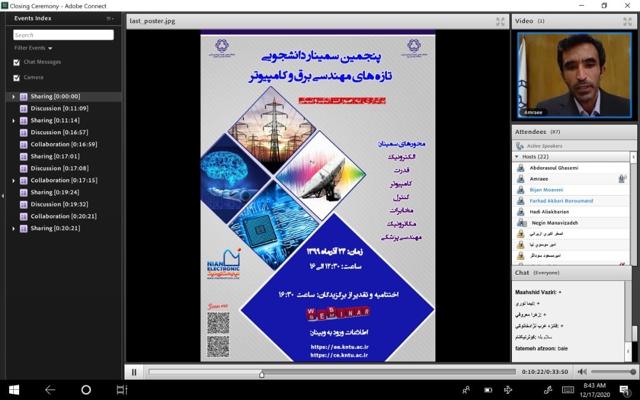 سپس  سمینارهای منتخب در شش نشست تخصصی مجازی الکترونیک، کنترل، کامپیوتر، مکاترونیک و مهندسی پزشکی، قدرت و مخابرات ارایه شدند. همچنین در این رویداد با ارزیابی و داوری توسط روسای هر نشست تخصصی، یک ارایه به عنوان سمینار برگزیده آن نشست مشخص گردید.