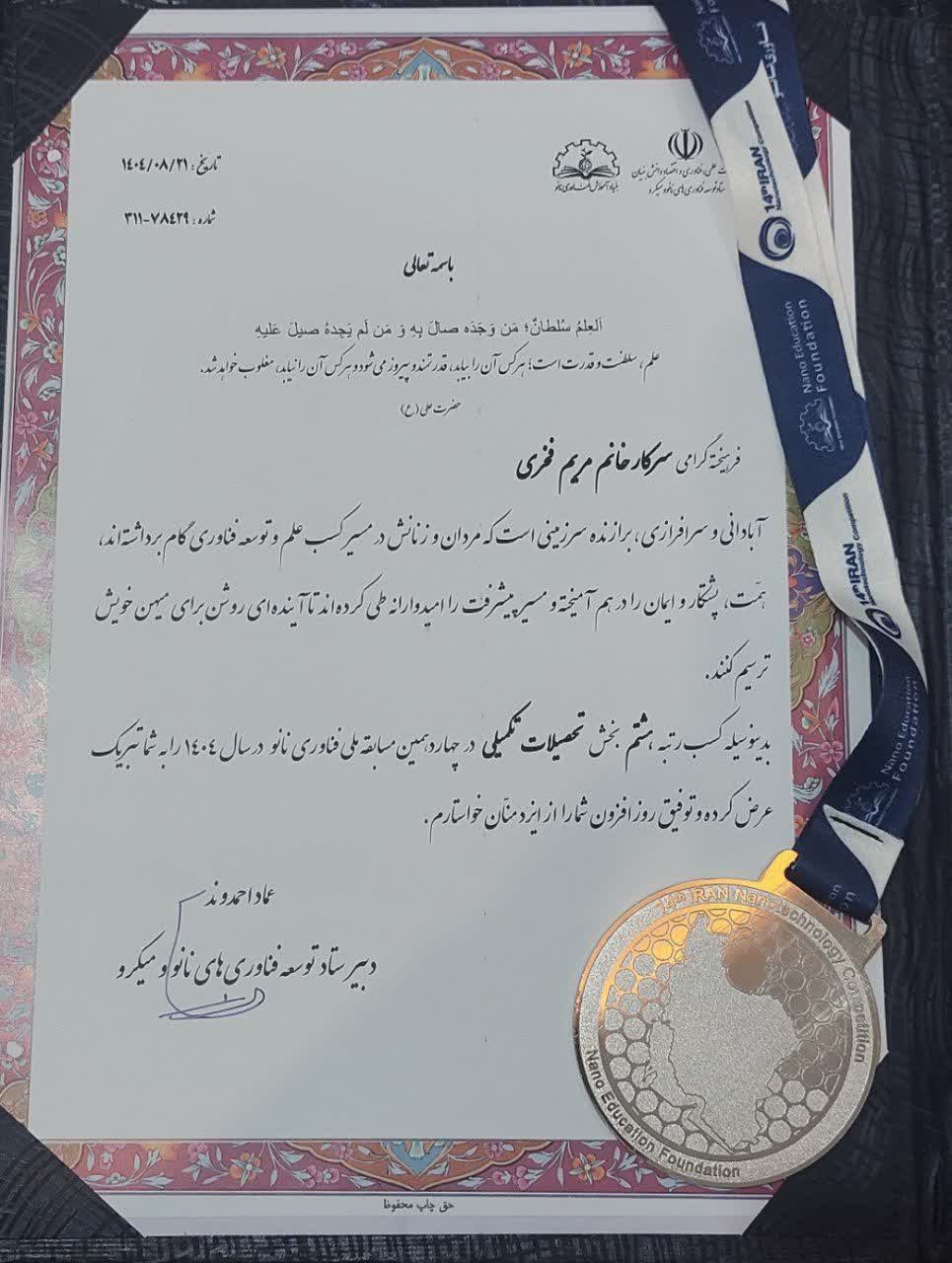 مریم فخری دانشجوی دکتری رشته شیمی فیزیک دانشگاه صنعتی خواجه نصیرالدین طوسی موفق به کسب مدال نقره این مسابقه در بخش تحصیلات تکمیلی شد.