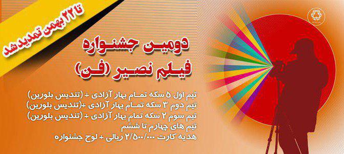 به گزارش روابط عمومي؛ دومين جشنواره فيلم كوتاه دانشگاه صنعتي خواجه نصيرالدين طوسي (( فن )) كه 20 آبان ماه 1395 آغاز به كار كرده است تا 22 بهمن تمديد شد.