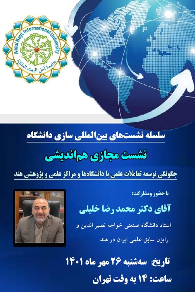 به گزارش روابط عمومی دانشگاه، روز سه شنبه مورخ 26 مهرماه ساعت 14 بوقت ایران جلسه هم اندیشی در خصوص تعاملات علمی و پژوهشی و دانشگاهی با شبه قاره هند با حضور دکتر خلیلی رایزن سابق علمی شبه قاره، دکتر صالحی معاون بین الملل دانشگاه بین المللی اهل بیت ، حاج آقا قمی معاون پژوهش و فناوری دانشگاه اهل بیت، آقای کلاته مسئول بین الملل دانشگاه بین المللی اهل بیت، آقای متانت مسئول جذب دانشگاه، آقای احمدی کارشناس بخش بین الملل به صورت برخط برگزار گردید.