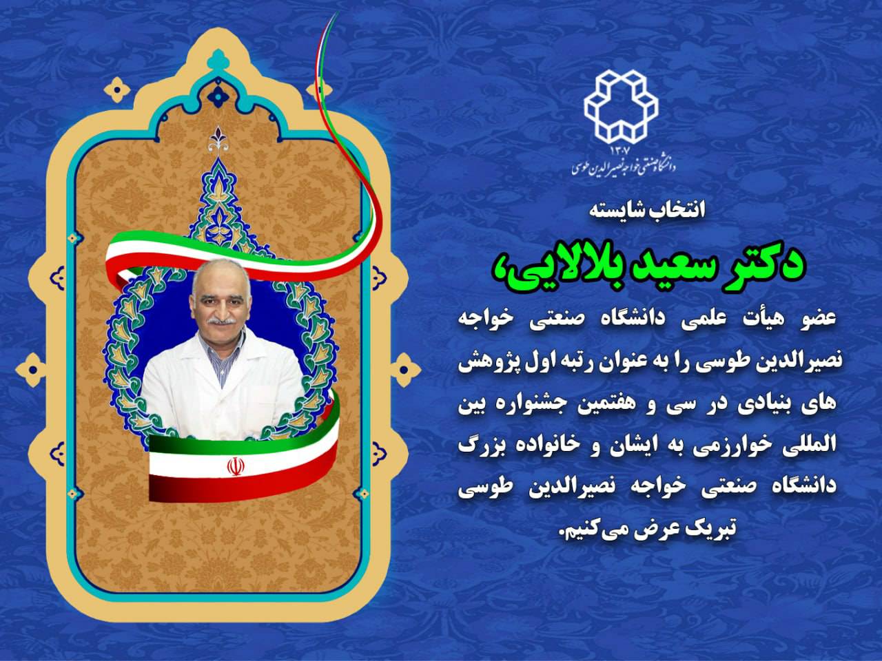 کسب موفقیت دکتر بلالایی، در سی و هفتمین جشنواره بین المللی خوارزمی