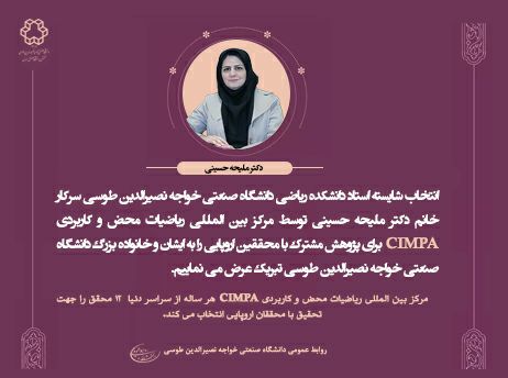 به گزارش روابط عمومی، استاد دانشکده ریاضی دانشگاه صنعتی خواجه نصیرالدین طوسی، دکتر ملیحه حسینی توسط مرکز بین المللی ریاضیات محض و کاربردی CIMPA برای پژوهش مشترک با محققین اروپایی برگزیده شد. انتخاب شایسته ایشان را به خانوادهٔ بزرگ دانشگاه صنعتی خواجه نصیرالدین طوسی تبریک عرض می نماییم.